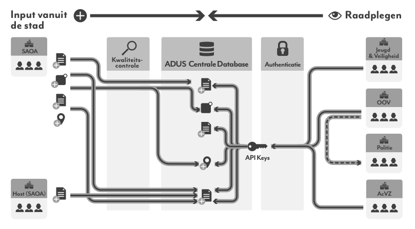 In technische zin hebben we de architectuur van het systeem naar een volgend niveau getild, met de principes van Common Ground als basis. In plaats van één alles omvattend systeem voor iedereen, is Straatnotes nu een applicatiefamilie geworden. Bestaande uit diverse losse en herbruikbare applicaties met in het midden een centrale database. Die laatste bevat alle informatie én de toegangsrechten conform de afgesloten convenanten en gegevensregeling.
